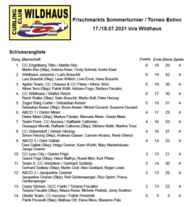 Il Team Fiore dello skip Raffy con Pepo, Stefano e Martino e l’Obelix Team con Patrik skip, Elena, Mattihas e Massimo si sono recati a Wildhaus per il tradizionale torneo estivo. A contendersi la vittoria, altre 2 squadre ticinesi. Una di Chiasso e una di Faido.