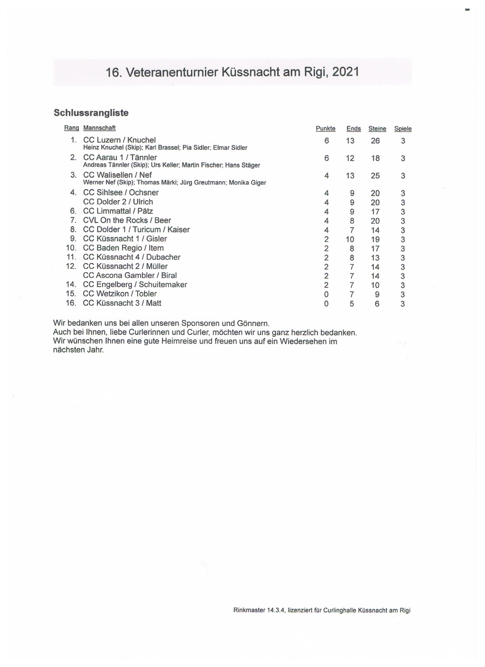 Rangliste Veteranenturnier